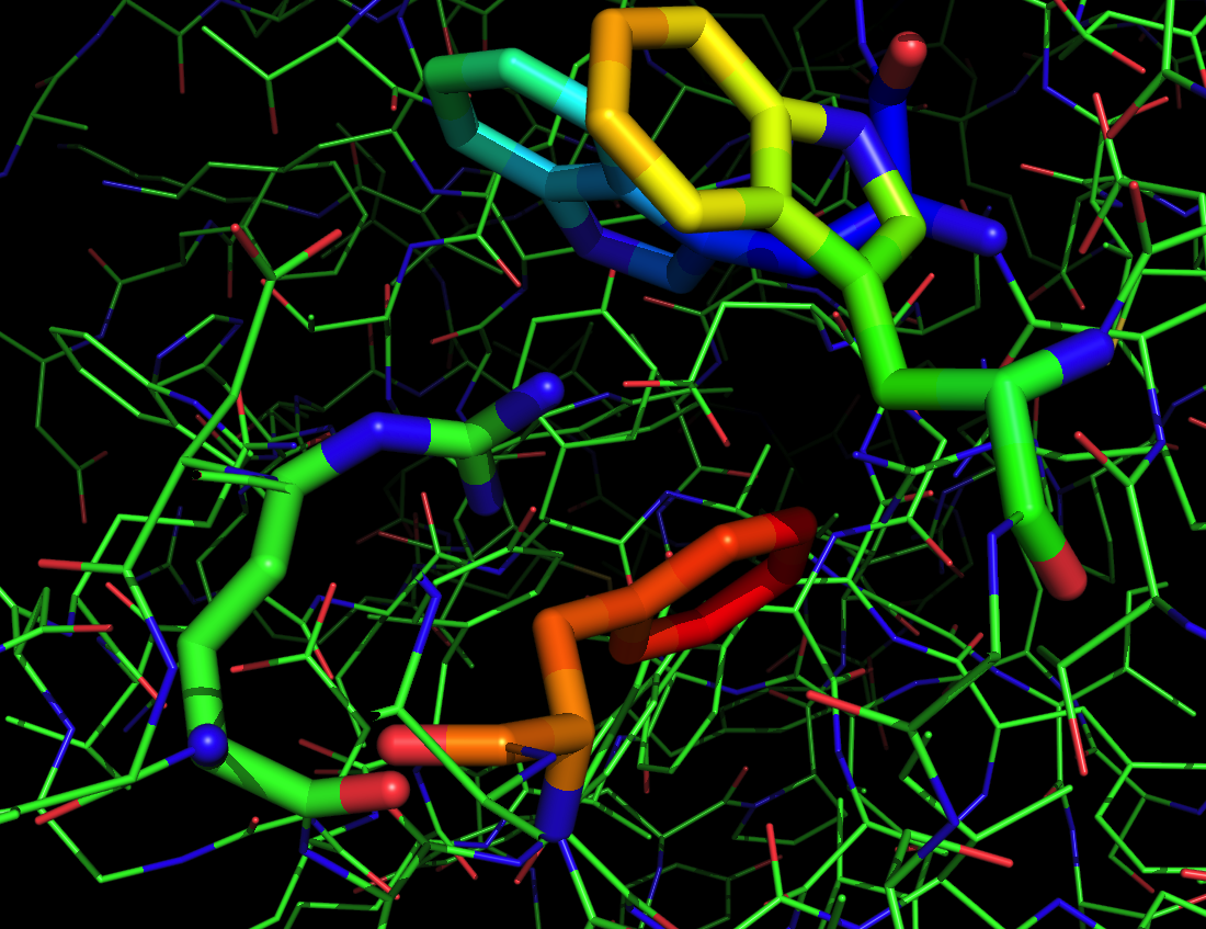 Below you see arginine. No one (in a million years) would suspect arginine to be a hydrophobic amino acid. This label would go against intuition that comes naturally to a chemist. Yet, hydrophobicity is also context-dependent. As a matter of fact, arginine is a residue par excellence in terms of stacking with aromatic groups, thereby plugging all sorts of hydrophobic pockets. Here is a view from a crystal structure Elena and I solved recently. You see how arginine’s guanidine group is perfectly positioned inside one of the aromatic cages that makes this particular protein special. We want to interrogate the pocket, yet it is filled. Arginine – please go away, darn it! We need our fragments there, not you…