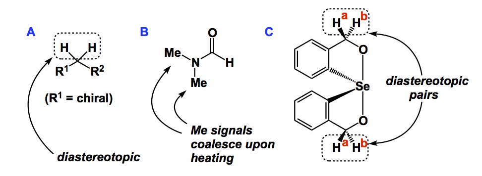 I want to mention one interesting piece of research that made me think (a lot). Take a look at the figure below. “A” represents a diastereotopic pair of protons in a generic RCH2R1 molecule. I can name many cases where VT NMR measurements have been employed in efforts to reveal the so-called coalescence temperature, which provides a measure of conformational preferences of a given compound. Dimethylformamide (inset B) is a simple achiral molecule that serves as a relevant example. In it, the methyl groups have different 1H NMR chemical shifts at room temperature, but coalesce at higher temperature. This property has important ramifications as it enables one to measure barriers to rotation, rate constants, etc. The example shown in inset “C” comes from Tom Back at the University of Calgary and teaches a peculiar behaviour seen in the 1H NMR of the depicted selenium compound. Apparently, the CH2 group appears as a AB quartet at 213K. Slowly but surely, this set of signals is transformed into a singlet at 291K. We might all be inclined to say: “Gotcha… This must be coalescence”. However, upon further heating, another AB quartet emerges at 377K! This appears to be a paradox, but only if we assume that coalescence of NMR signals of diastereotopic protons in variable-temperature experiments must be due to dynamic exchange processes. The danger of default assumptions… The re-appearance of the AB quartet at higher temperature (inset C) suggests that coalescence must attributed to coincidental chemical shift equivalence. In other words, the two diastereotopic protons that are shown display temperature-dependent chemical shifts that change in opposite directions, and whose coalescence is not to be equated with dynamic exchange. This is a fascinating finding suggesting that a lot of papers out there need to be reexamined (just heat beyond coalescence, baby, and see what happens).