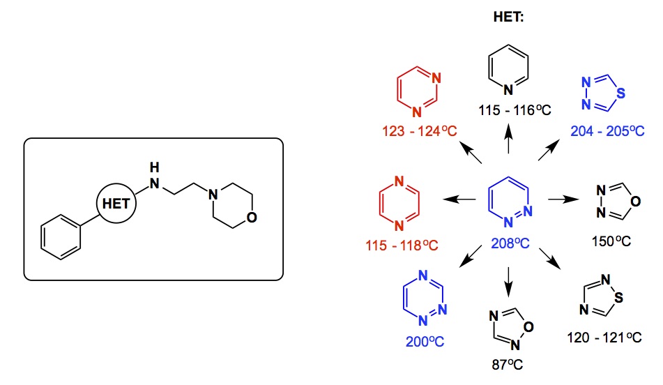 Imagine a bioactive compound about to undergo a medchem-style optimization. Let’s say this molecule contains a heterocyclic core. The question is: are there any measurable metrics that might suggest a rationale for replacing the existing core with some other heterocycle? In other words, do we have something in our disposal which is less Edisonian than “screen baby, screen”? I was really intrigued by a statement made by Wermuth in his MedChemComm paper. This article praises the virtues of pyridazines in medicinal chemistry (I am not going into that whole “privileged” business…). It turns out that for the particular biological application considered in this reference (biology is beyond the point tonight), the most potent cousins of the pyridazine-containing compound contained thiadiazole and 1,2,4-diazine rings, which are curiously close in their boiling points. The less potent derivatives contain pyrimidine and pyrazine, which also boil close to each other. The lesson here is that a boiling point reflects a dipole moment, which is an excellent comparative metric.