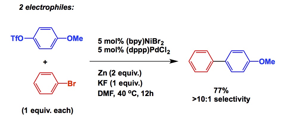 I have followed the work of Daniel Weix for some time and was keen to learn about his lab’s recent advance published in Nature. This paper is interesting for several reasons. First of all, it describes a solution to the problem of making unsymmetrical biaryls from two different electrophiles, which runs counter to the conventional way of joining a nucleophilic species (e.g. a boronate) and an electrophilic one (e.g. an aryl halide). The solution offered by the Weix lab has come in the form of a multimetallic system comprising nickel and palladium. While the idea might seem transparent on paper, the devil is in the details and the realization of unsymmetrical coupling has been elusive and took years to develop. Apart from some really interesting scope study (just look at compound 19), there are notable mechanistic lessons in this paper. In my view, the most important of them relates to confronting entropic factors (in other words, reducing the possible amount of products you might imagine here). It turns out that the palladium intermediate formed does not react with itself, is stable, and accumulates in solution. On the other hand, the nickel intermediate is “hot” and transient. It has capacity to react with itself or with the aforementioned palladium complex. Understanding the relative concentrations of these species in solution holds the key to attaining high selectivity of this reaction. When Daniel described this system to me, I was also left with the impression that potassium fluoride played a very important accelerating role in this imaginative catalytic process.