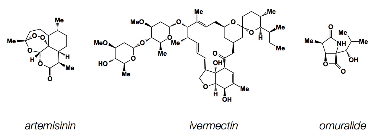I was really glad to see the Physiology/Medicine Prize go to the natural products researchers Tu Youyou, Satoshi Omura, and William Campbell (http://www.nobelprize.org/nobel_prizes/medicine/laureates/2015/). Tu’s work decades ago had led to the discovery and development of artemisinin, which then went on to save countless lives. I was interested to learn that the anti-malarial program was launched by the Chairman Mao in response to the abysmal loss of life to malaria during the Vietnam war. Countless scientists, including Tu, were mobilized to evaluate the traditional Chinese pharmacopoeia with the goal of finding the “magic bullet”. This was an all-out effort that culminated in an amazingly simple insight on behalf of Tu: to extract qinghao’s active ingredient using cold, not typically prescribed hot, solutions. Of course we know that artemisinin is distinguished by the presence of a peroxide bridge, which makes the molecule heat-sensitive. Omura and Campbell were in turn recognized for their work on ivermectin. This is a great story in itself as it also highlights Merck’s timely attention to the discovery of life-saving therapeutic therapeutics by academics. Professor Omura is well known for many other natural products, including impressively selective proteasome inhibitor omuralide (it is easy to see we where that name comes from).